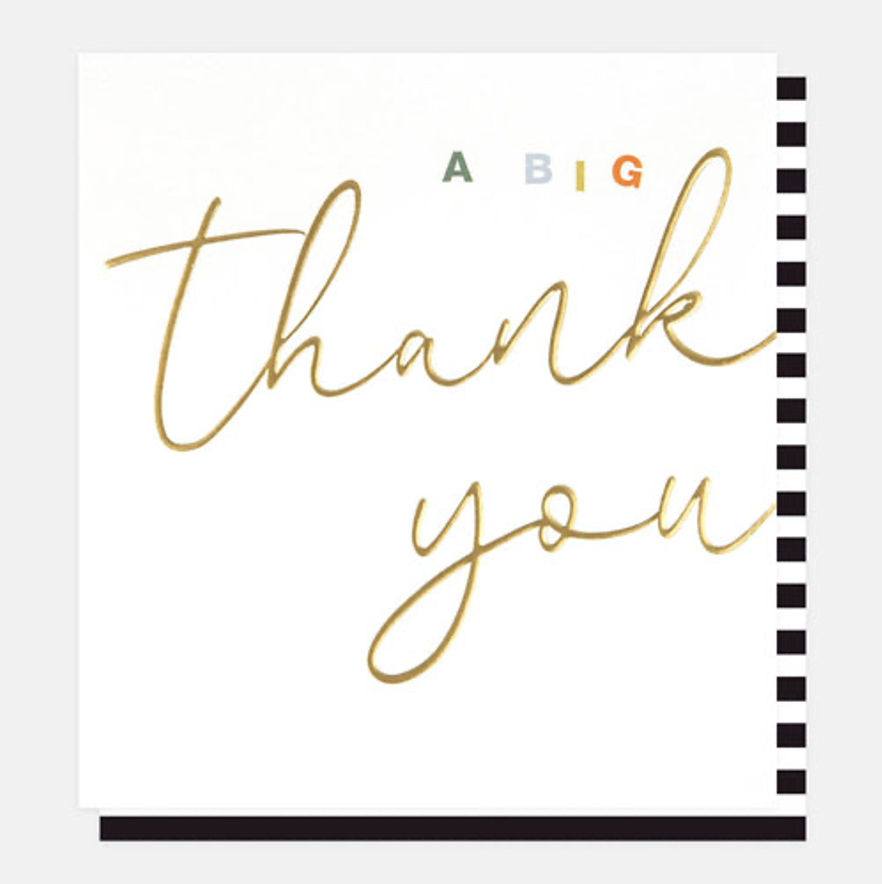 A quirky but sophisticated card from Caroline Gardner, sending someone ‘a big thank you’. Blank inside for your own message. Cards can either be sent to you or directly to the recipient with a handwritten message of your choice.