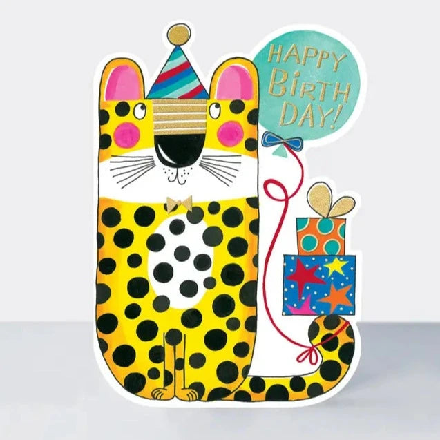 This fantastic birthday card for children has a wonderful die-cut shape with a cute leopard character. It is printed with bright inks on textured board and finished with hot gold foil and is supplied with a colour co-ordinated envelope.