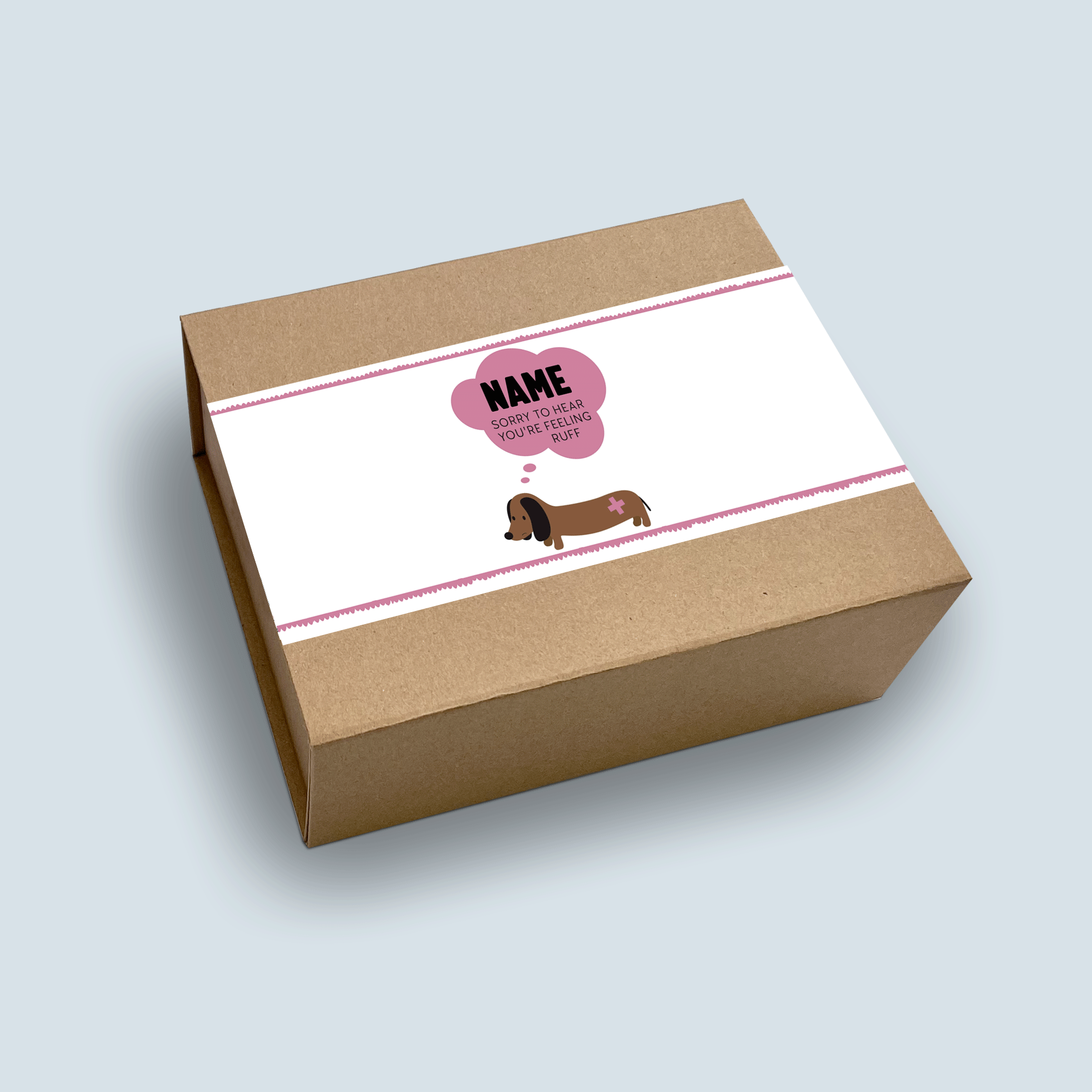 Personalise your gift box with this ‘Feeling Ruff’ belly band. Featuring a cute sausage dog, the message reads ‘sorry to hear you’re feeling ruff’ and can be personalised with any name or nickname of your choice.