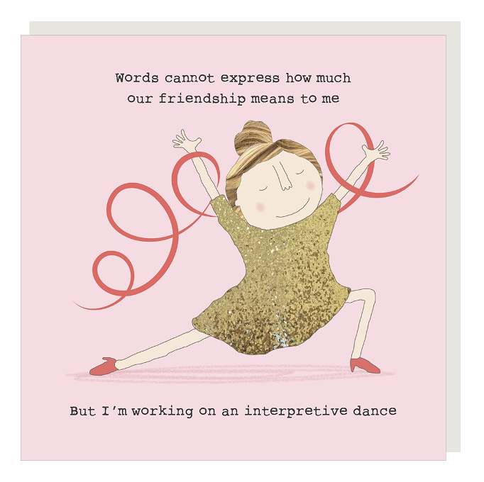 Text on the front of the card reads ‘Words cannot express how much our friendship means to me … But I am working on an interpretive dance’.