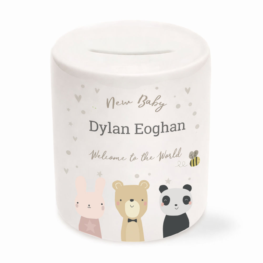 Celebrate the arrival of a little one with our personalised new baby keepsake money box, a thoughtful and lasting gift designed to be treasured for years to come. Beautifully personalised with the baby’s name, this adorable baby money box features charming characters including a sweet teddy, panda and bunny, making it a delightful addition to any nursery.