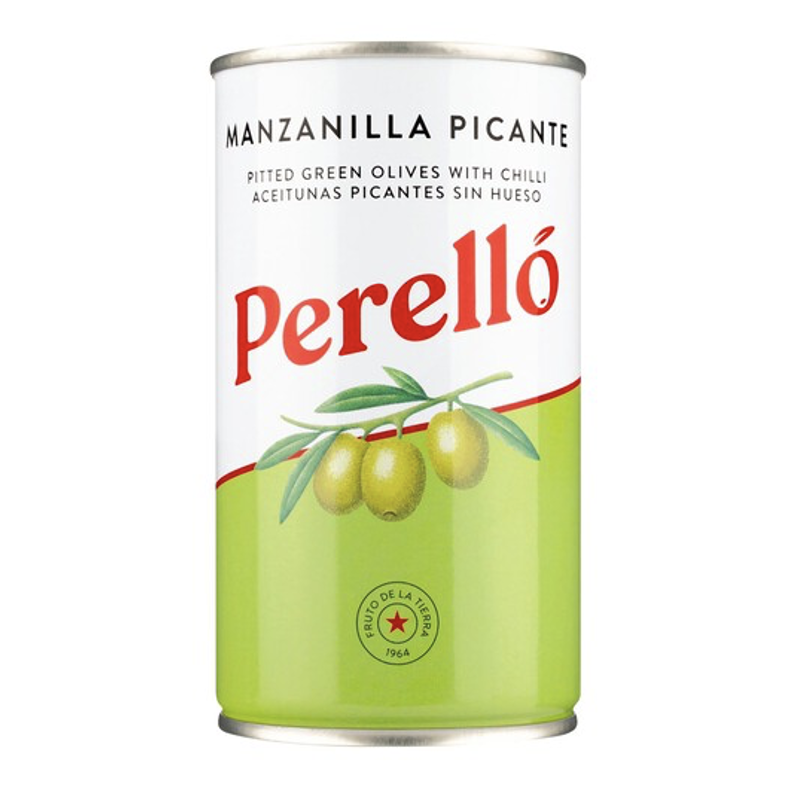 Perello Manzanilla pitted olives are great eaten straight from the tin as an appetizer or served as part of a charcuterie board. Traditionally grown in Seville, these plump, green olives are preserved with hot chilli, giving the salty snack a fiery kick.
