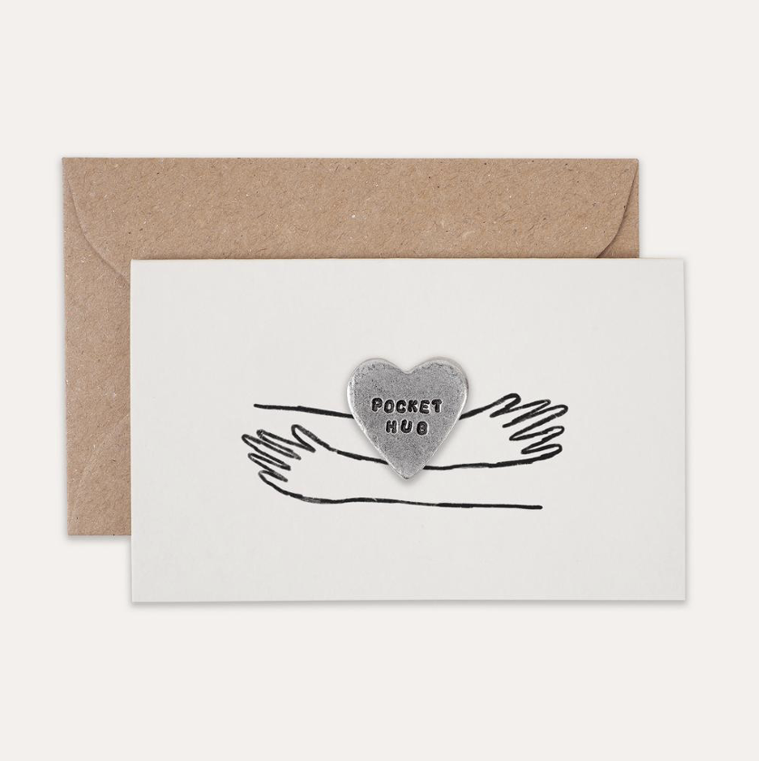 This sweet little token features a hug illustration on a soft, oatmeal coloured card with a solid metal heart that reads “pocket hug”. The token can be kept in a wallet or pocket as a token of your love.
