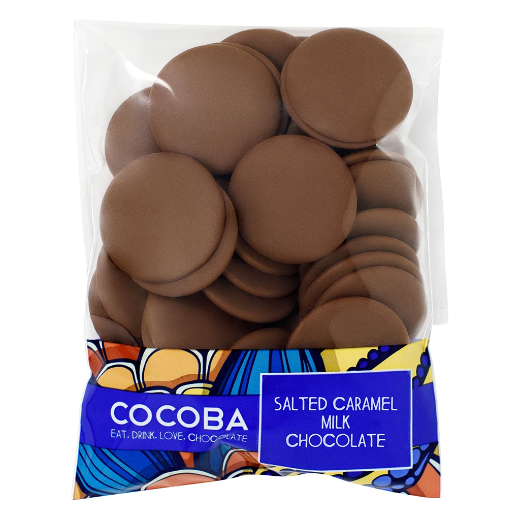 A bag of indulgent Cocoba Belgian milk chocolate buttons, perfect for a small moment of sweetness.