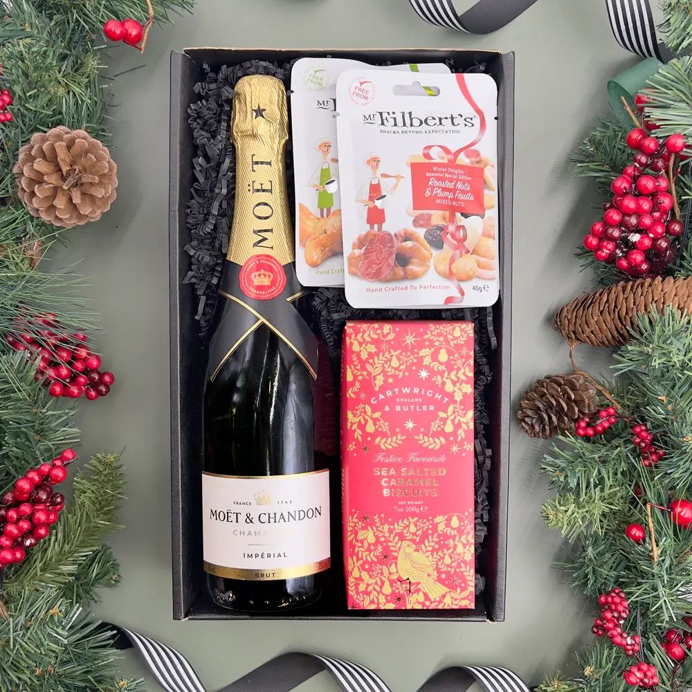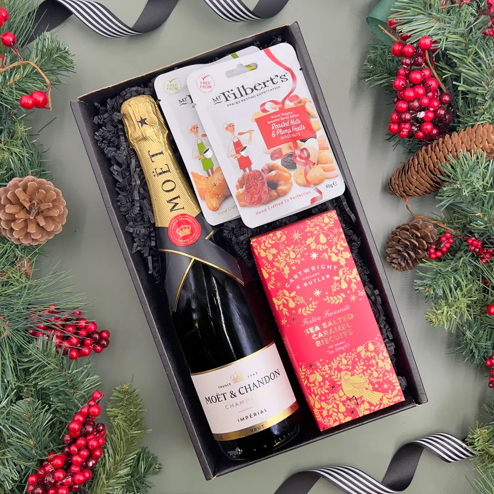 A fizzy festive hamper filled with a mixture of sweet and savoury snacks. The perfect gift set for a Christmas Day toast! The Christmas Champagne And Treats Gift Box Hamper includes: