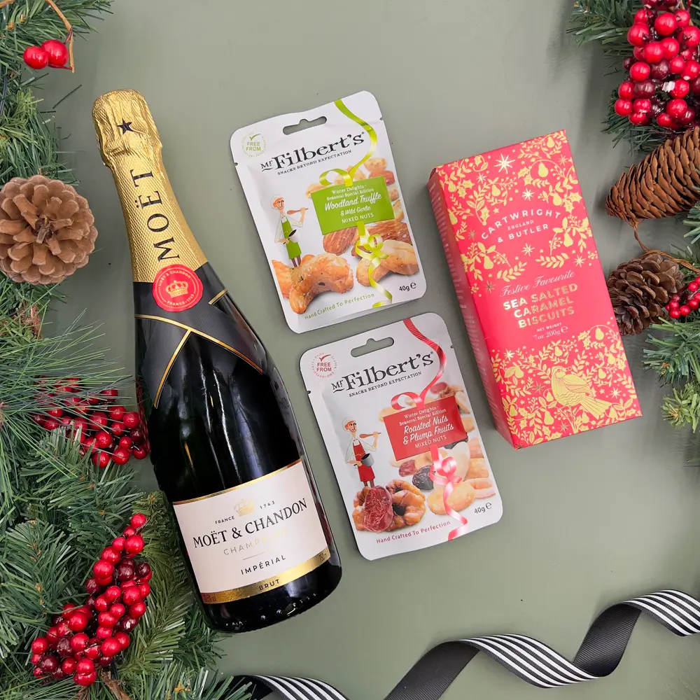 A fizzy festive hamper filled with a mixture of sweet and savoury snacks. The perfect gift set for a Christmas Day toast!