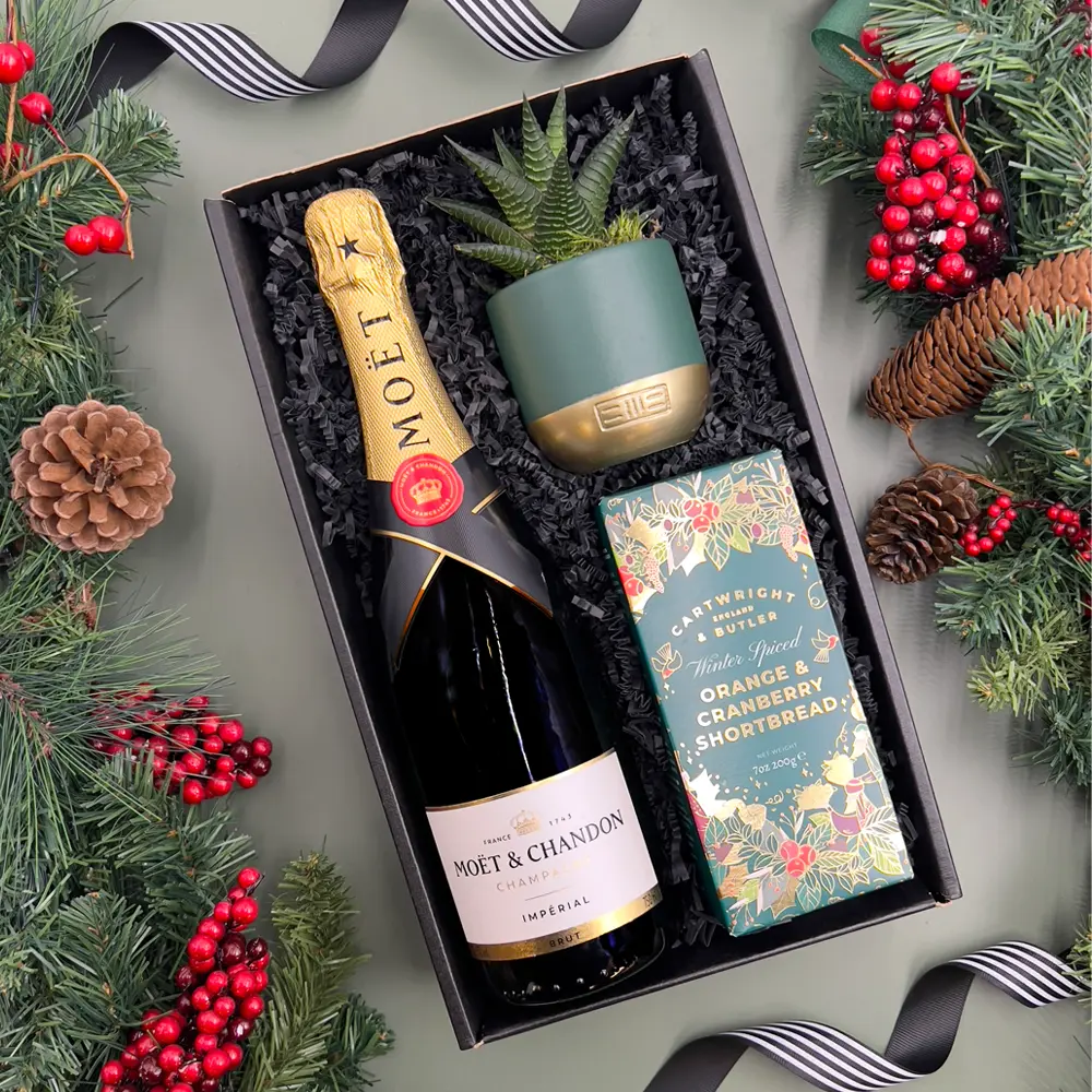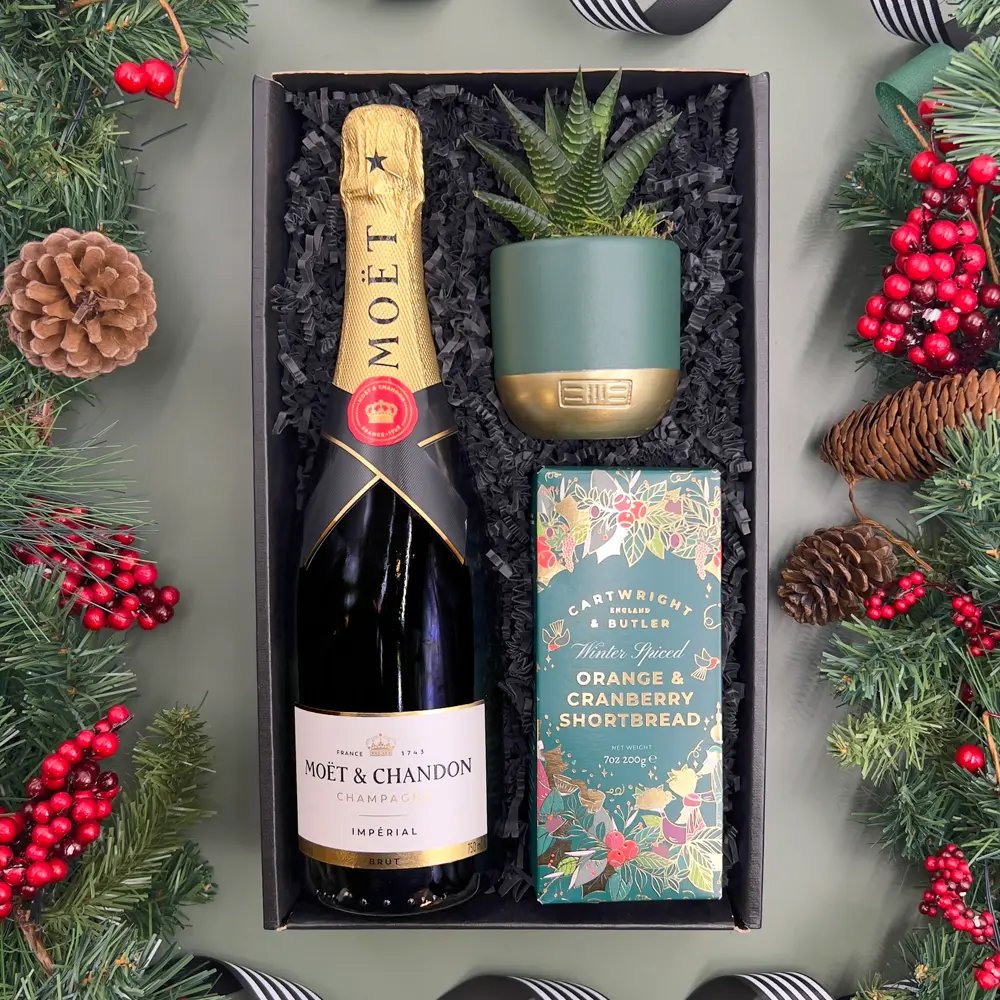 Celebrate the festive season with this luxurious Christmas Hamper, ready to be sent straight to your loved ones. Filled with Moet et Chandon Champagne, tasty shortbread biscuits and a beautiful succulent, to act as a loving reminder to the holidays all year round. The Christmas Champagne And Succulent Hamper Gift Set includes: