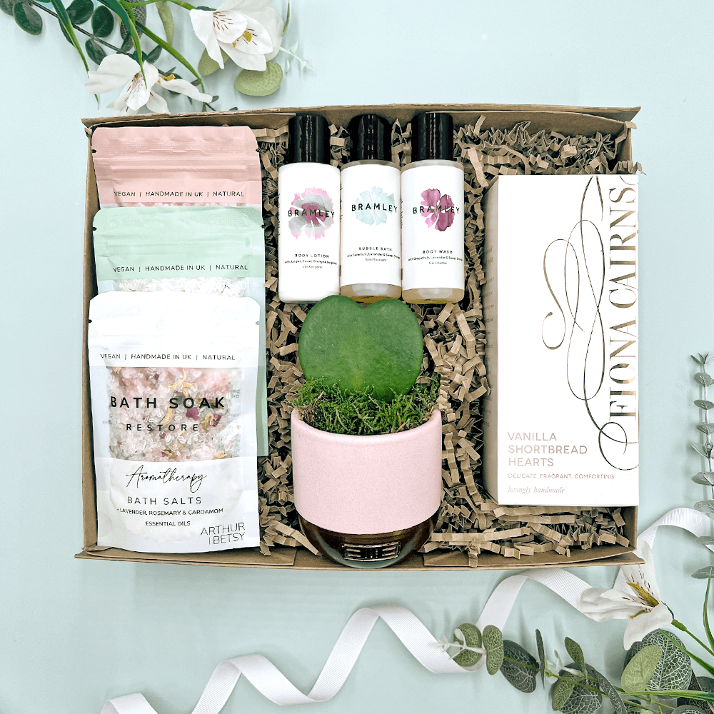 Treat her to a beautifully curated Mother’s Day pamper hamper designed to help her relax, unwind and feel truly appreciated. This luxury Mother’s Day gift box combines indulgent self-care treats, delicious biscuits and a charming heart-shaped succulent. The perfect ready-made Mother’s Day gift, lovingly wrapped and delivered.