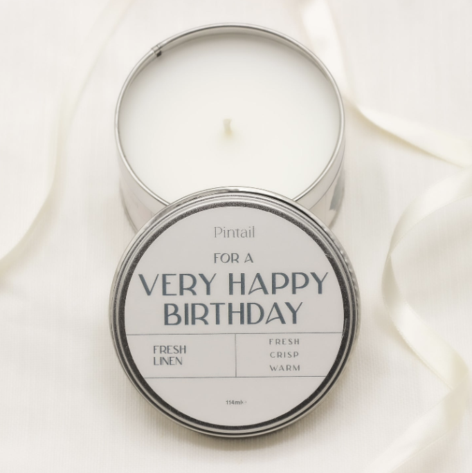 ‘Very Happy Birthday’ Fresh Linen Candle Tin